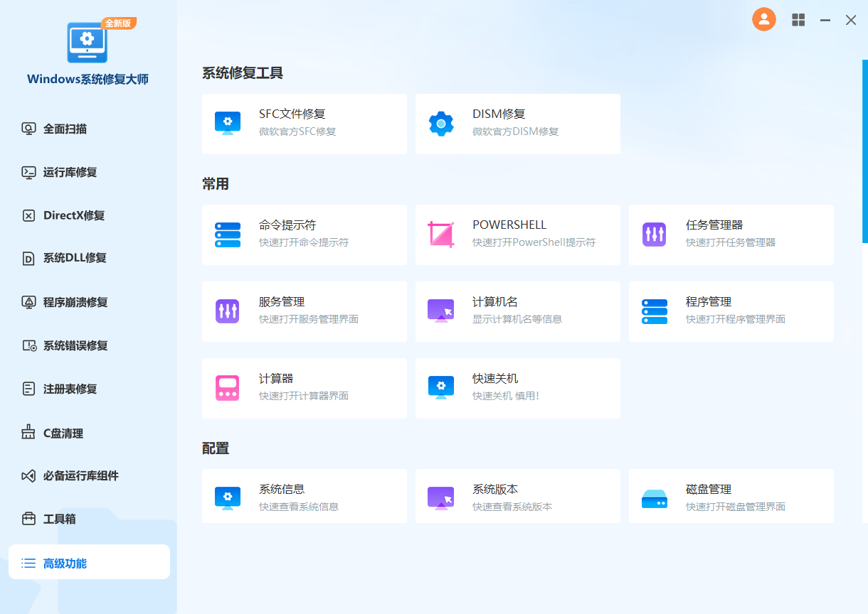 - · 修复系统频繁黑屏、蓝屏、死机、网络掉线