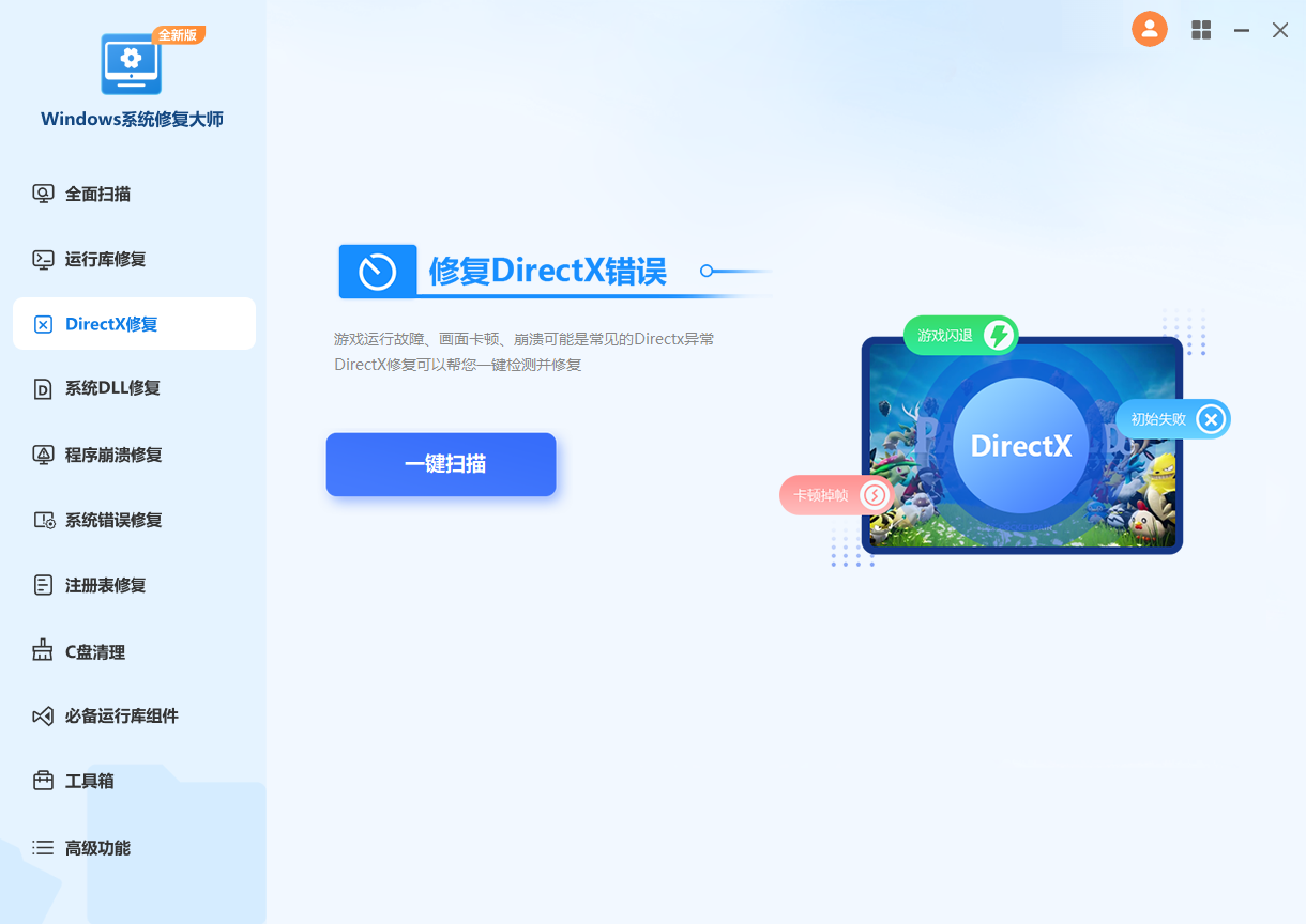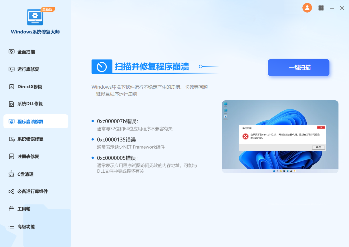 - · 自动修复系统运行环境与核心组件缺失损坏问题